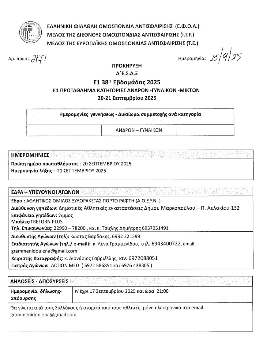 Προκύρηξη Εθνικού Πρωταθλήματος Ξυλορακέτας 2025