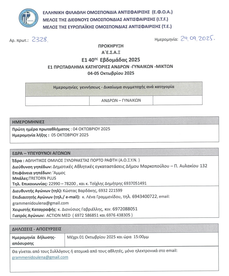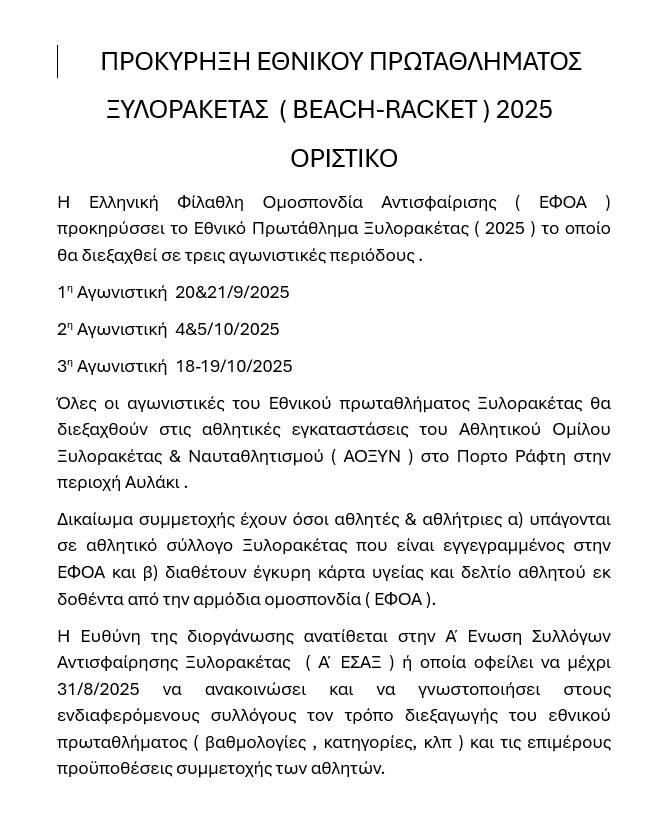 Διακοπή Εθνικού Πρωταθλήματος Ξυλορακέτας 2025